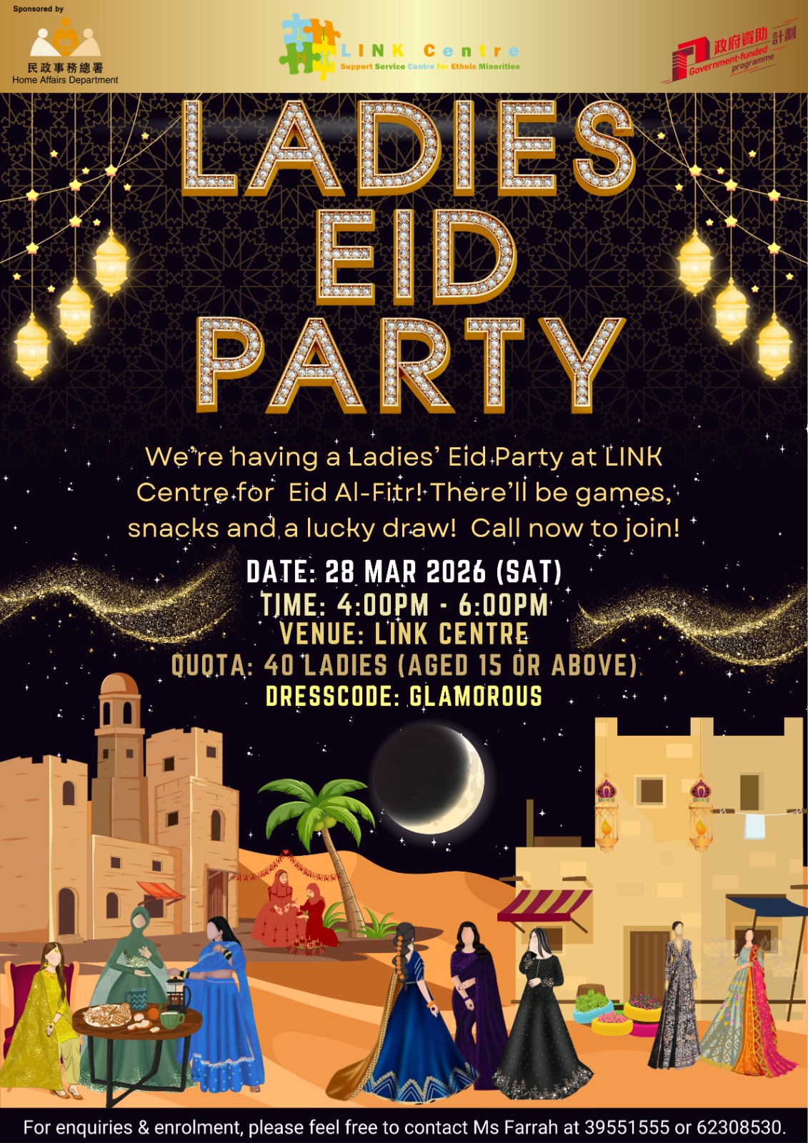 We’re having a Ladies’ Eid Party at LINK Centre for Eid Al-Fitr! There’ll be games, snacks and a lucky draw! Call now to join!